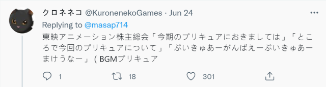 他在推特上表示,这次加入股东大会会议,居然有七成的应答都是关于动画作品《光之美少女》系列的事情,对于这样的讨论,根本就像粉丝见面会一样,针对该系列作公司的未来规划进行商讨。