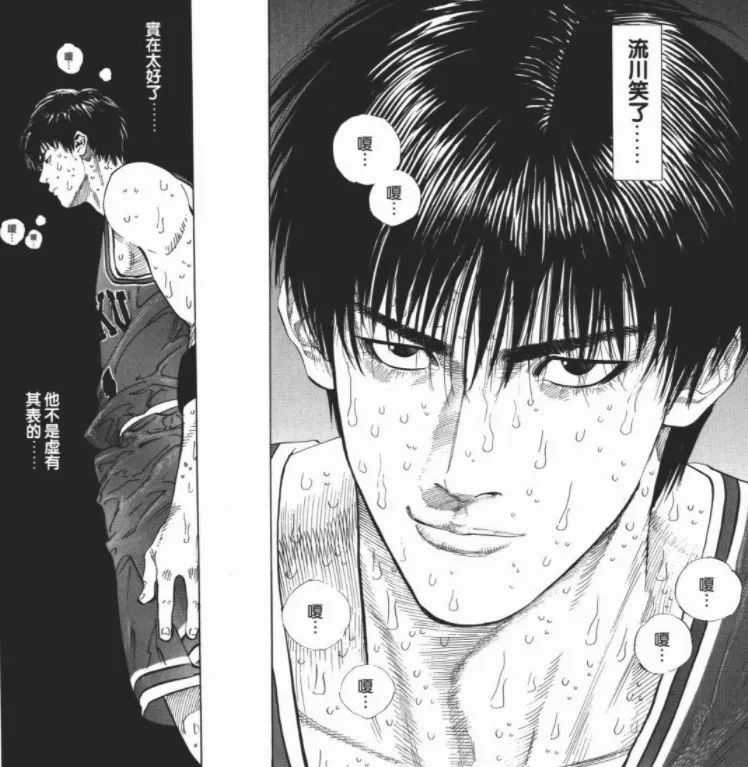 可以看到冷面美男流川,露出了难得的笑容——不是进球后,而是当他被强敌泽北逼入绝境时。遇强则强,从现在起开始布局,打倒泽北,才是这场比赛最大的乐趣: