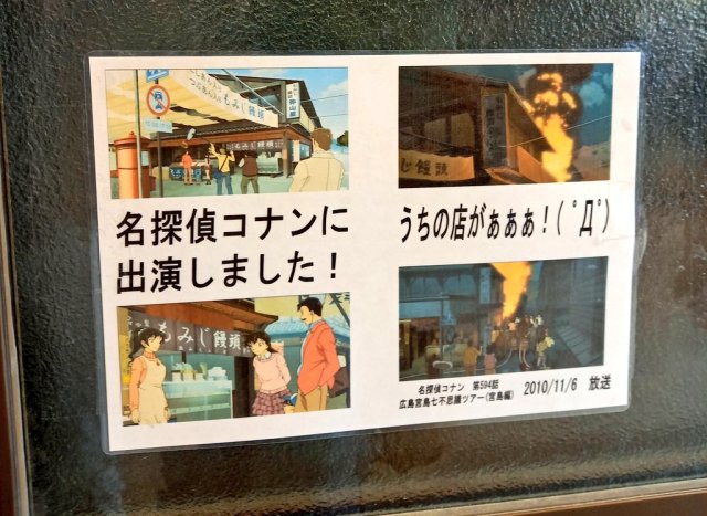 日前,就有一位名叫M yuka(@Myuka34442559)的Twitter网友,在前往广岛宫岛旅游时,就发现有一知名店家「岩村もみじ屋」,外面贴着「我们在《名侦探柯南》裡面有演出」的小海报,还特别注明是在2010年11月16日时,放送的第594话「广岛宫岛的七大不可思议之旅(宫岛篇)」。