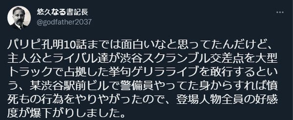 在Twitter上有曾于涉谷做过保全的关系者表示「本身觉得到作品10话为止还很有趣,但是后来主角群和劲敌们用大卡车霸占了涩谷路口,举行快闪演唱会。身为曾经在涩谷站前某大楼做过保全的人,实在是会令人气死的行为,让我对所有登场人物的好感度瞬间暴跌了。
