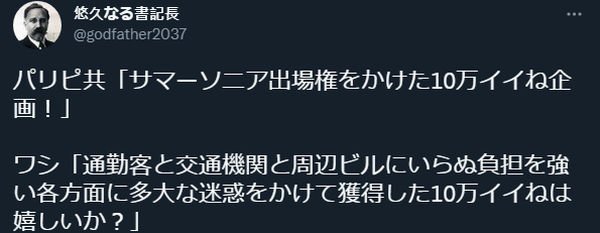 这位网民更进一步指剧情中为了获得参加音乐祭的权利,靠着这招赚到10万个赞。给通勤的人和交通机关和周遭的大楼添了这么大的麻烦,就算赚到10万个赞会开心吗?