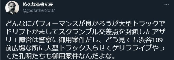 而且也用了较现实的可能性「不论表演得再怎么好,用大卡车快闪封锁路口肯定会令警察出动。而且涩谷109前广场同样不能开大卡车办快闪演唱会,孔明阵营也同样逃不过警察啊。」