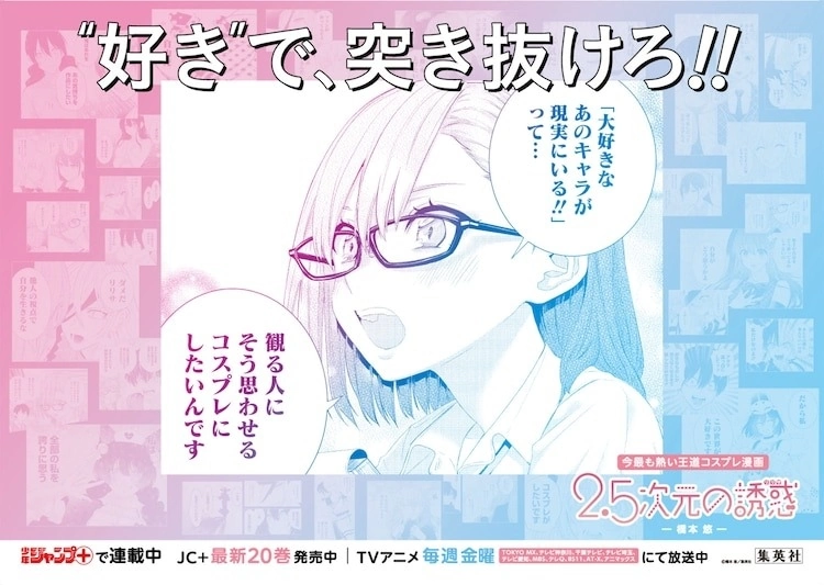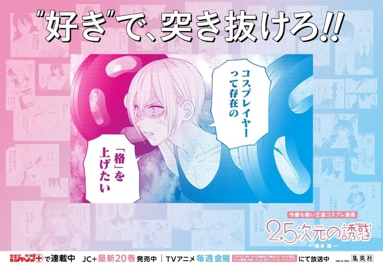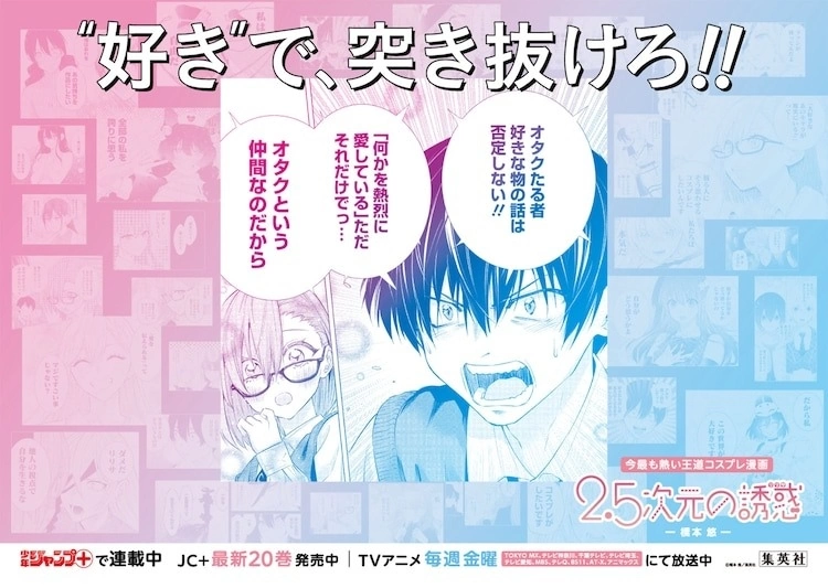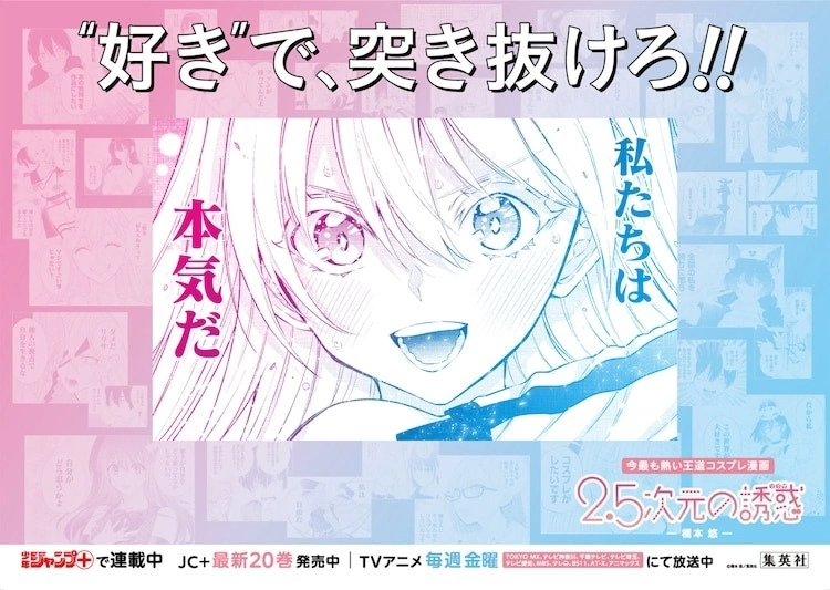 这次的广告不仅纪念动画开播,同时也纪念最新单行本 20 集发售。广告一共有 30 款,传达本作“青春、热血、角色扮演”等要素,以漫画中名场面搭上“用‘喜欢’,突破次元!!”这句宣传词,可以感受到作品中潜藏的热情。