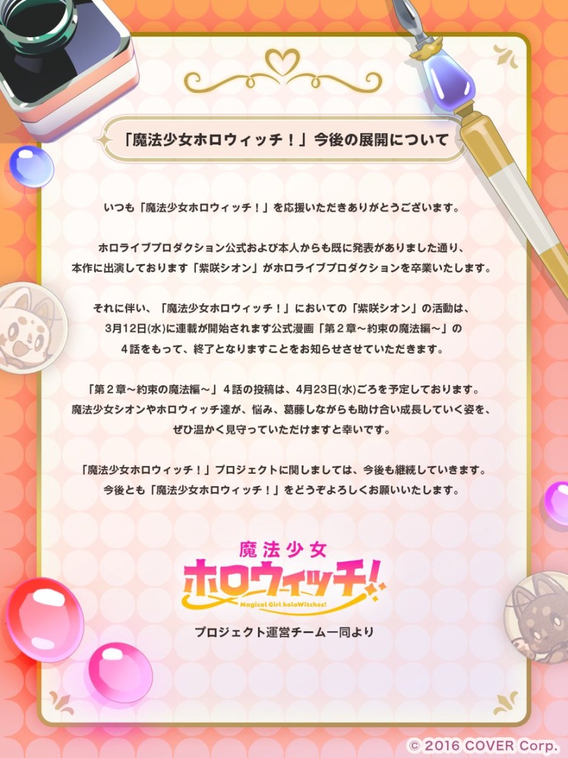 虚拟偶像团体 hololive 旗下多媒体企划“魔法少女 holoWitches”(魔法少女ホロウィッチ!)于昨日(3月11日)对于所属成员紫咲诗音(紫咲シオン)的毕业和企划未来发展发表声明。