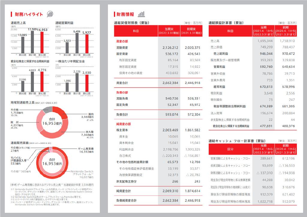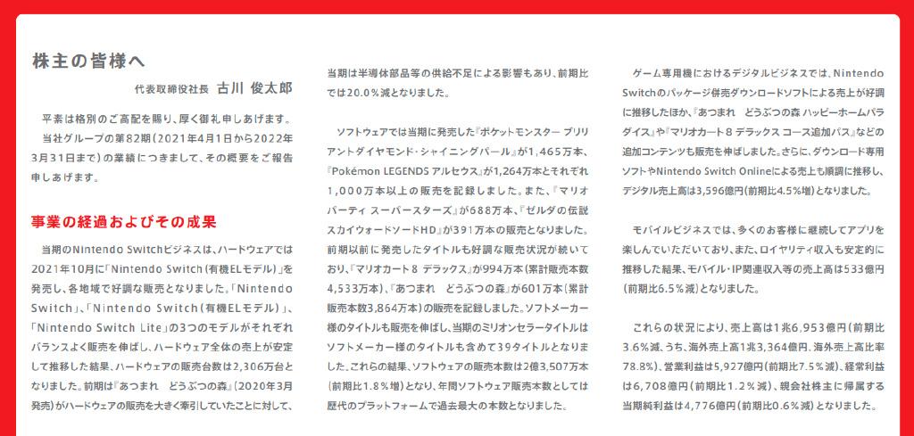 任天堂官方昨日(6月30日)公布第82期股东业绩报告,据年报数据显示,任天堂2021年总销售额16953.44亿日元,同比减少3.6%。由于汇率等原因影响,净利润4776.91 亿日元(折合港币277亿元),同比减少0.6%。