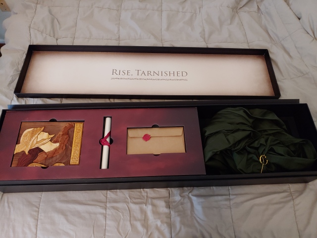 打开礼物一看,其中包含一个刻着女武神的木制浮雕、感谢信与交界地的地图,还有一团绿色的织品,似乎是梅琳娜的斗篷?