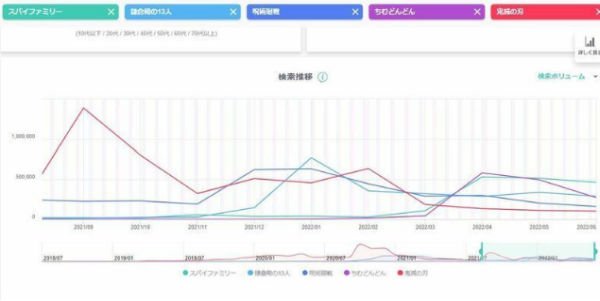 由于《SPY×FAMILY 间谍家家酒》的原本名字有不同说法,使得该作的搜索结果有些分散。在6月的搜索量中,日版标题《スパイファミリー》约有46万次,英文版《Spy x Family》则超过1万次。但到了《スパイxファミリー》,则数量非常少。其原因大概是名字中的「x」一般使用英文代替,日本用户可能将其省略了。