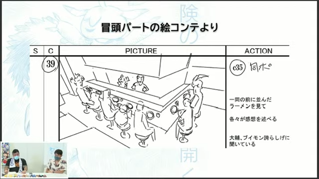 另外,担任动画电影《数码宝贝大冒险02:THE BEGINNING》的监督田口智久也简单展示出开场分镜画面,表示在正片一开始,会带入到已经开始经营拉面店的本宫大辅与V仔兽,并进而带到两人口中的往事,再加上先前公开的前导海报中,或许本作很有可能会谈及主角大辅在成为「被选召的孩子」前的过往经历。