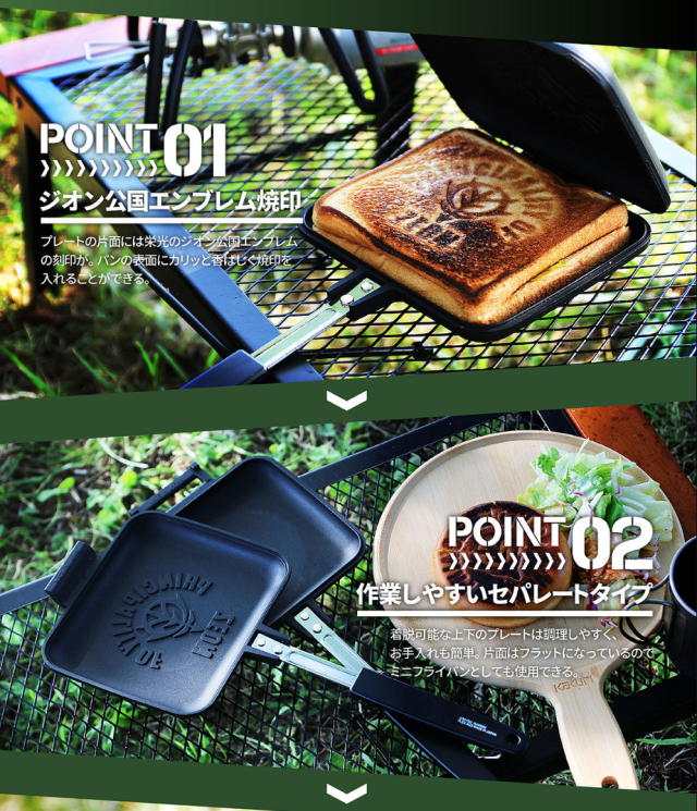 热压吐司锅本体分成上下两层,可以组装成为一体。上面有著「吉翁公国」专属的军徽 Logo,「PRINCIPLE OF ZEON」字样更象徵了吉翁专用的注册商标,让你做出美味料理也可以展现吉翁的荣耀。