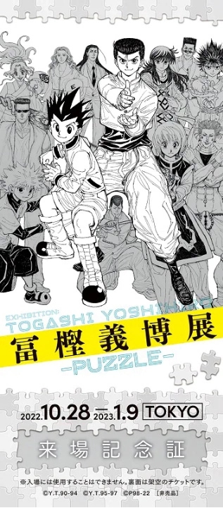 官方也公开门票贩售详细,有日期场次指定券、一般入场券、附压克力小物盒的周边入场券等三种票券于 eplus 贩售,入场特典是「双面纪念证」,共有三款随机发送,其中一面是展览会的宣传海报,另一面是以《幽游白书》、《灵异E接触》、《猎人》三作为概念设计的入场票券,想必会让粉丝相当兴奋。「富坚义博展 -PUZZLE-」将自 10月28日~2023 年 1月9日 止在东京森艺术中心艺廊举办,也预计巡迴至大坂及福冈两地展出。