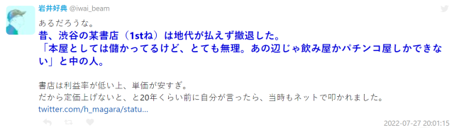 引发讨论的推特原文指出,其实日本今年从 4 月起,因为电费调涨的关系,加上原有的租金考量,不少书店承担越来越多成本。这样的原因也让营业额本来就不高的书店在日本倒闭现象越来越常见,这些店里的书本其实都卖得出去,消费者也不少,但这些利润已经无法 cover 支出,只能关店收场。