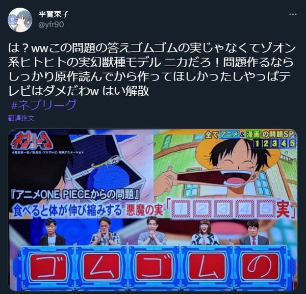 近日日本富士电视台的节目「ネプリーグ」 举办了动漫常识猜谜特备企划,然而其中一题被归类为等级1的简单难度的题目问《ONE PIECE》的主角路飞吃的恶魔果实名是什么。嘉宾们都一致回答橡胶果实(ゴムゴムの実),不过这回答却在网络上引发热讨。