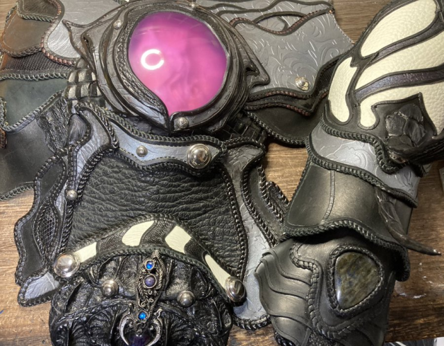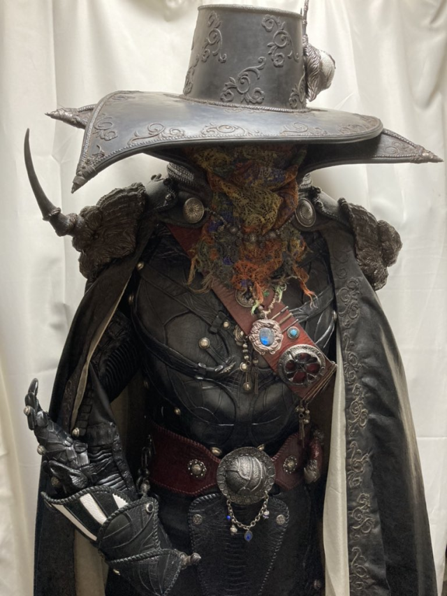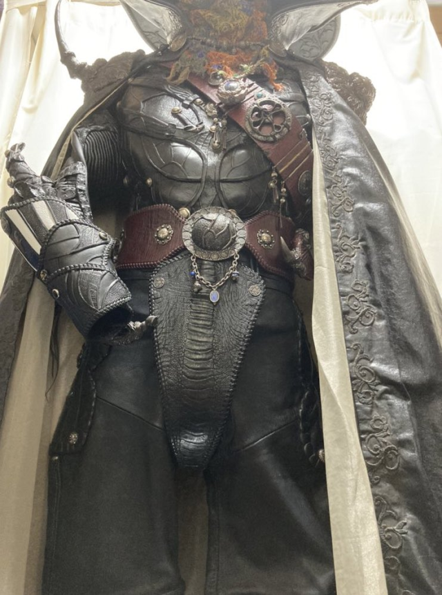 这整套服装与配件,都是他自行挑选材料制作而成,包括身上的动物皮革、金属配件以及丝绸布料等,皆参考原作设定集中的设定制作,如此长年的制作对他来说已经是生活的一部分,也展现自己对作品的热爱。