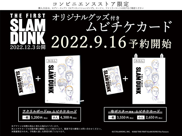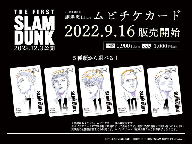 根据官方资讯,自2022年9月16日开始,日本各大戏院与网络预购,将会开放民众预购,票卡共有樱木花道、流川枫、赤木刚宪、宫城良田、三井寿等五种款式。价格方面分为一般票1900日元,与儿童票1000日元。