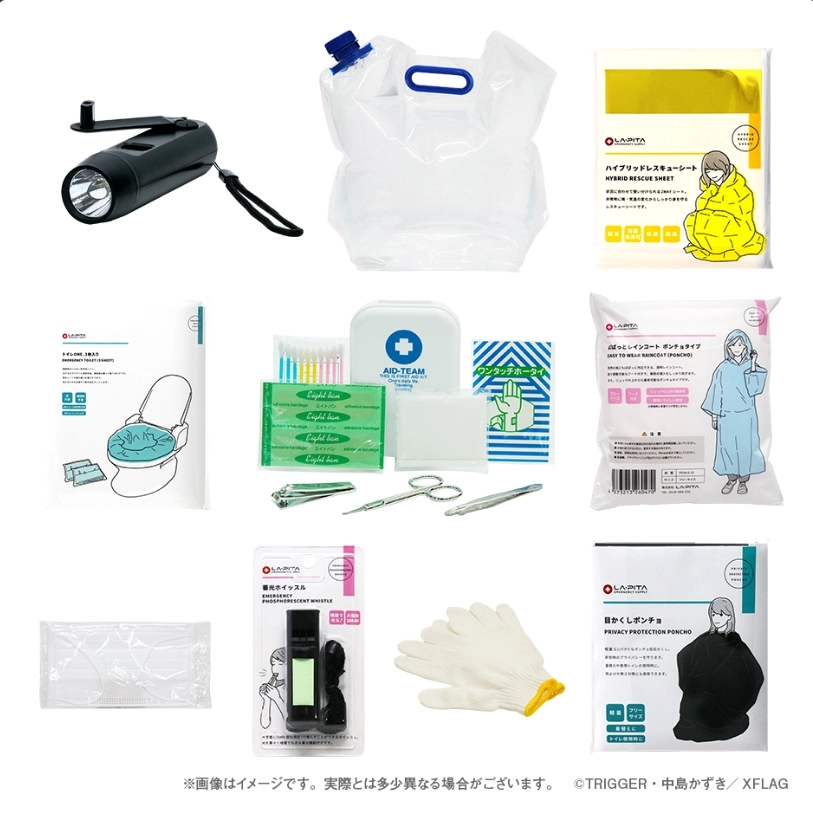 防灾组合包中有日本防灾士监修过的 11 项防灾避难用品和《普罗米亚》周边商品,包括:《普罗米亚》原创毛巾、三个圆徽章、替换用防灾卡片组、醒目的红色大后背包、智慧型手机也能连接使用的手电筒、十公升提水袋、紧急防寒毯、携带用厕所、应急处置急救包、斗篷型雨衣、三层式口罩、蓄光充电式哨子、棉布手套、轻便更衣帐。防灾组合包含税价 14300 日元,预约期限到 9月30日 日本时间 23:59,商品预计 12 月中旬陆续发送。
