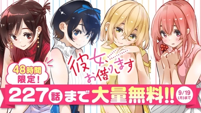 为了迎接电视动画《出租女友》第二期的最终回,目前 Magazine Pocket 正在举行漫画第 1~227 回 48 小时免费阅读的活动,自 9月18日 日本时间 0 点起到 9月19日 日本时间 23:59 止。