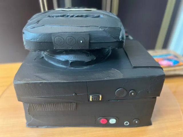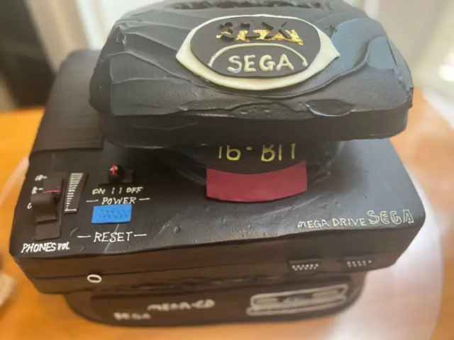 当然蛋糕是请专门的蛋糕师制作,选择了 Mega Drive 与 Mega CD 两款主机堆叠起来,可以看到不只主机还原,连插槽都不马虎,真的很用心 QQ。