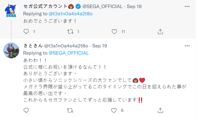 SEGA 官方推特也在さ之さん的推特献上祝福,可以被官方注意到也让さ之さん十分惊喜,对于 SEGA 粉丝来说,这真的是最棒的祝福了吧 QQ。