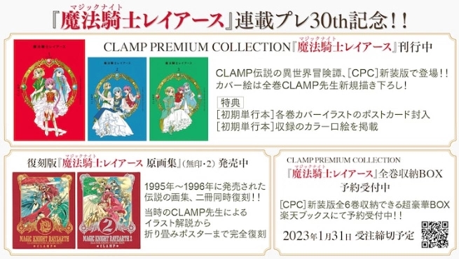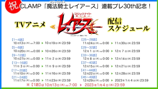 为纪念 CLAMP 作品新装版《CLAMP PREMIUM COLLECTION 魔法骑士雷阿斯》单行本第一集、《复刻版 魔法骑士雷阿斯 原画集》、《复刻版 魔法骑士雷阿斯2 原画集》三本书同时发售,官方推动动画同时上架,预计每周四上架全新四集,每集限定一周时间观赏。