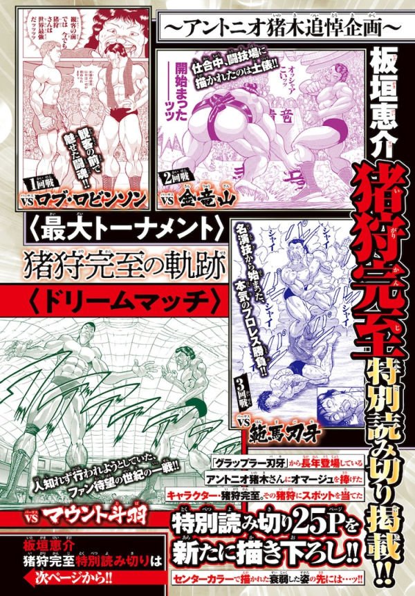 为了悼念于10月1日去世的日本知名职业摔角选手或综合格斗家安东尼奥·猪木刃牙作者板垣惠介推出新的外传进行悼念。