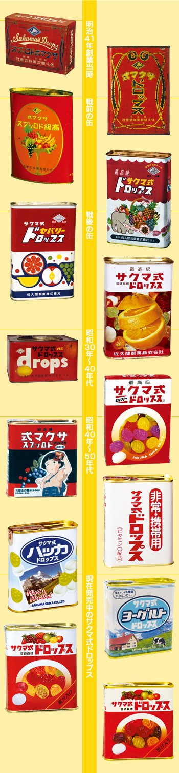 「佐久间制菓」最为人知的就是知名水果糖「サクマ式ドロップス」(佐久间式水果糖),相信大家就算没看过《萤火虫之墓》也多少对这个商品有印象。以铁罐包装,上方有著不大的开口,要取出里面的糖果真的不容易 XD,有时候糖果还会黏在一起,只好拿之前还要敲一敲罐子,算是部分人的童年回忆。