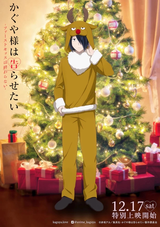 本作将描述电视动画第三期之后的故事,在电视播出前以特别上映的形式,于 12月17日 在日本公开。这次的圣诞版宣传海报一共公布辉夜、白银、伊井野、穿著麋鹿装的石上和藤原五款,以闪闪发亮的圣诞灯饰为背景,让人确实感受到圣诞节的脚步正慢慢靠近。