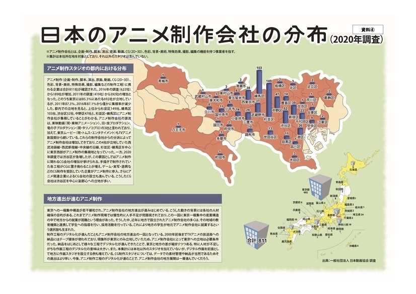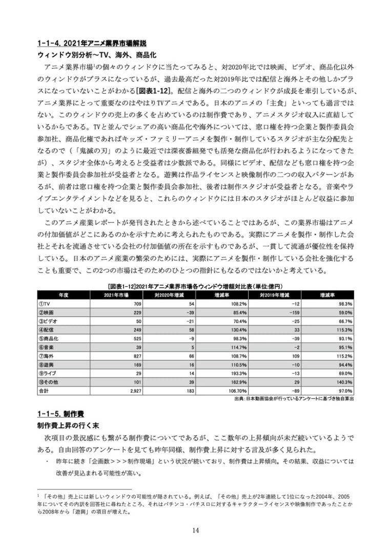 日本动画协会自 2009 年起对动画产业进行调查统计、分析,并将每年的结果于国内外广发。2021 年度基于动画制作公司的问卷调查结果显示,广义来说的动画产业市场相较前一个年度成长 113.3%,总额为 2 兆 7422 亿日圆,居然还更新了过去的最高产值。主要的原因是包括串流、转播等数位影音市场比前一年成长 165.9%(1543 亿日圆)、商品化收益比前一年成长 114%(6631 亿日圆)、日本以外的海外市场则成长 106%(13134 亿日圆);而动画制作第一线人员表示「接到的案件持续增长」、「企划数量远大于制作单位的状况依旧持续,制作费也有增加的倾向。确实可以看到收益情况改善、提昇的可能性」,同时也反映了制作现场人手不足、制作单位的数量已经不足以支撑作品企划产出数量的高风险情况。