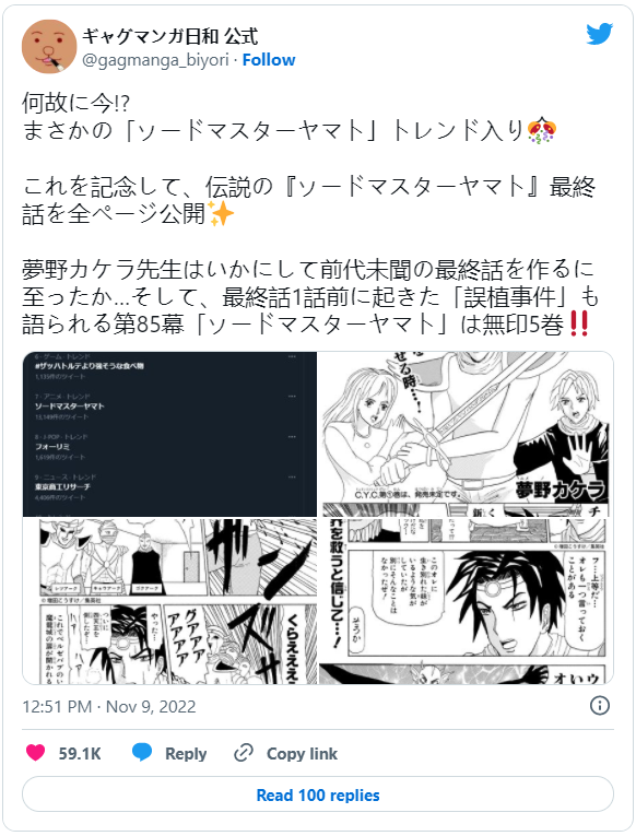 増田こうすけ原作漫画《搞笑漫画日和》(ぎゃぐまんがびより)昨日(11月9日)在官方推特上剧中剧「圣剑大和」(ソードマスターヤマト)篇传说的最终回内容。