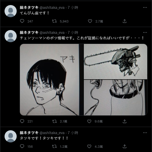 不过各位也真的可以放心,责任编辑林士平先生也发推证实,这支名叫藤本タツキ(@ashitaka_eva)的帐号,真的是那位人人都认识的漫画家藤本树本人,因此网友粉丝们也可以安心按下追踪Follow。