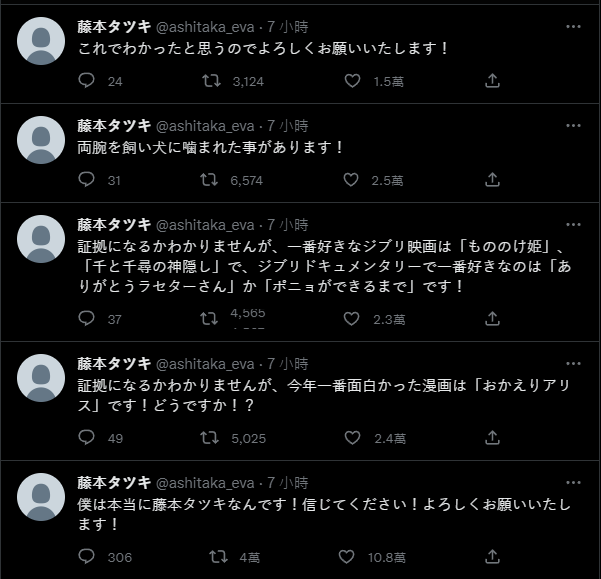 但八成也是很怕被当成不知道哪个路人冒充的假帐号,藤本树老师也很努力地四处解释,连发好几篇「身分证明」推文,大喊着「是我啦!我是树啊!」、「我是天秤座!」、「我的双手被狗咬过!」…等很有个性的贴文,来证实自己真的就是《链锯人》作者本人。