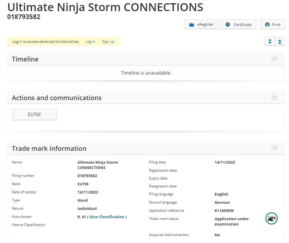 万代南梦宫娱乐的新注册商标为「Ultimate Ninja Storm Connections」(终极忍者风暴连接),而「Ultimate Ninja Storm 终极忍者风暴」一词是推出过多款游戏的《火影忍者 终极风暴》系列的欧美版英文名称,有可能暗示是下一款作品的标题。