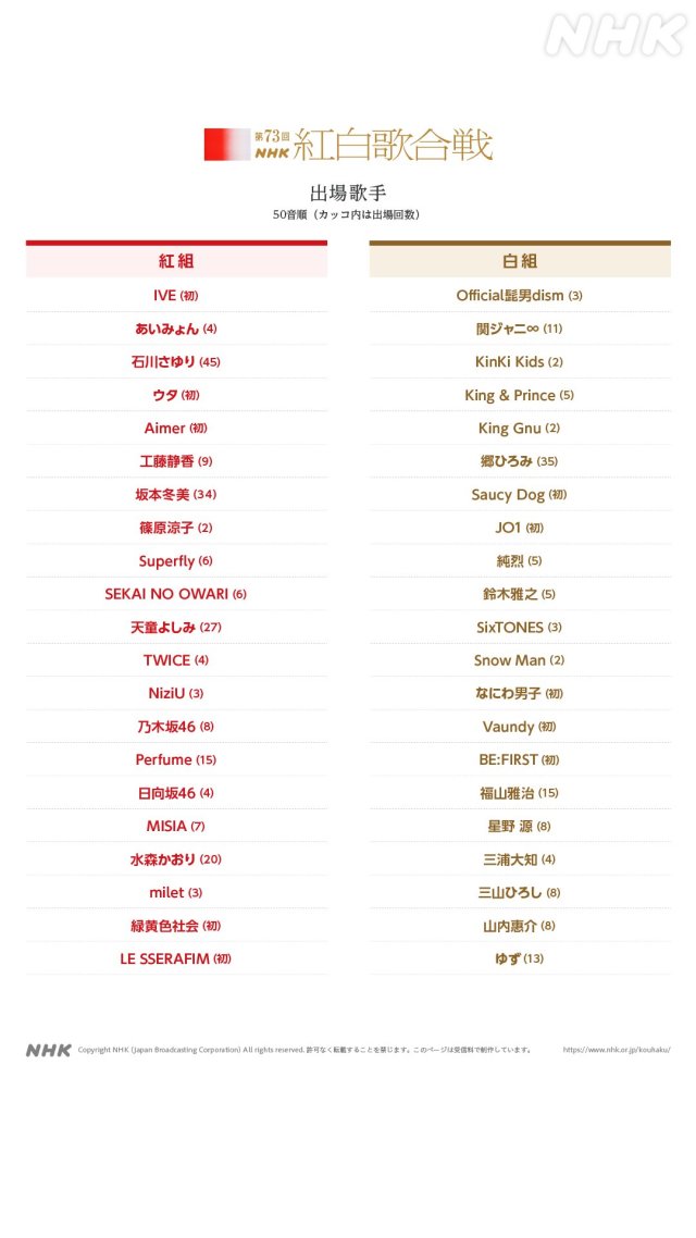 NHK第73回红白歌唱大赛将于2022年12月31日晚上7点20分开始,一直到11点45分结束,至于歌曲名单也有待之后官方的进一步公告。
