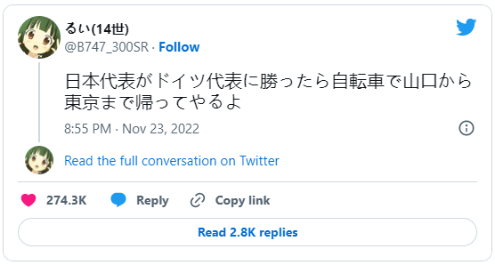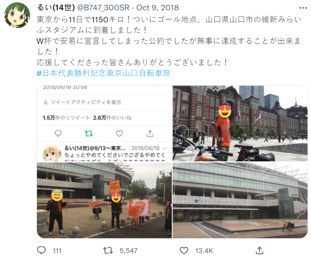 这几天日本人最开心的事情,莫过于世界杯足球赛逆转赢过德国的喜悦,几乎让不少日本人感觉彷彿像梦一般的存在。而在推特上也出现不少祭品文,其中一位网友-るい ( @B747_300SR ) 在当天发推文表示 : 「赢德国就骑脚踏车近千公里回家。」,而这趟旅程是从日本山口县到东京,距离可是超过 1000 公里的路程,现在梦想成真,大批网友涌入祝贺,期待他的成果。