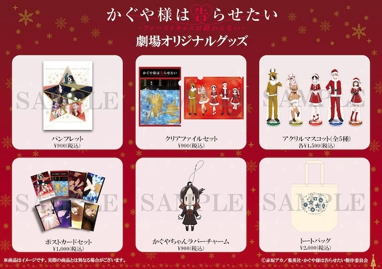 另外也公开了将在电影院贩售的週边清单,商品皆以圣诞节角色插图製作,有场刊、资料夹组、压克力立牌、明信片组、辉夜吊饰及托特包。