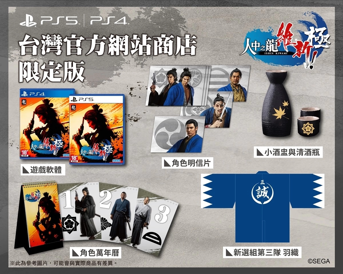 此外,本次《人中之龙 维新! 极》限定版还有推出另一个「中国台湾官方网络商店限定版」的组合,除了上述周边外,还多了新选组第三队羽织一件。这个组合仅开放在 SEGA 官方直营的「SEGA Taiwan 网络商店」贩售。