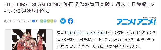 忠实粉丝们的青春与回忆,《SLAM DUNK》新动画电影《THE FIRST SLAM DUNK》迎来了上映两周,票房已经突破30亿,连续两周登顶日本电影票房排行榜。