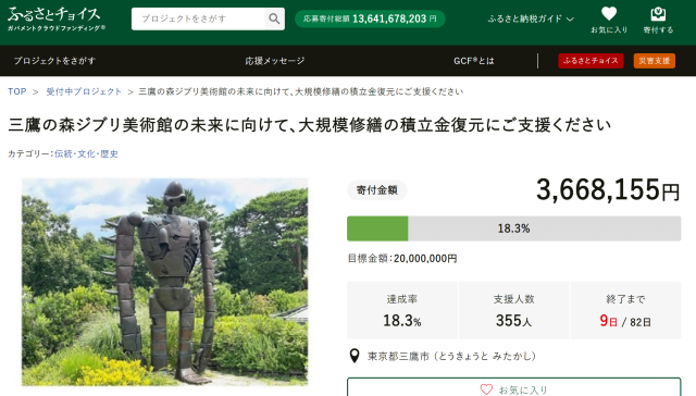 相信有不少吉卜力粉丝去日本旅游会朝圣的三鹰之森吉卜力美术馆(三鹰の森ジブリ美术馆),近年来受到疫情影响,官方只能透过募资来纾缓财务困难。虽然在去年 ( 2021 年 ) 很快就达成超过目标的 5000 万日元,不过在今年再次以故乡税的形式募资,却从 10 月至今仅获得 300 多万的捐款,让美术馆的营运让人看到危机。