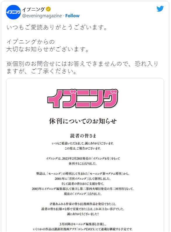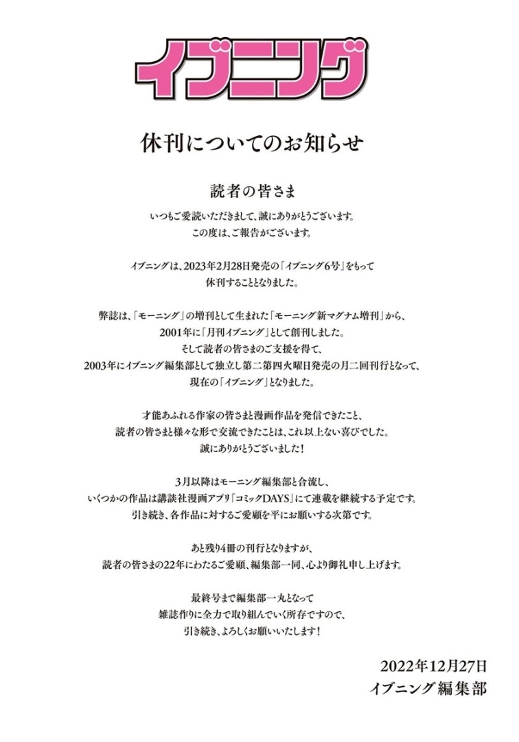 官方公告表示,编辑部们对于这二十多年间与许多才华洋溢的作者合作感到十分荣幸,与读者们的交流更是为工作中带来了不少乐趣;从 2023 年 3 月起 Evening 编辑部将与 Morning 编辑部合併,一部分作品转移到「Comic Days」进行网路连载,希望读者们在仅剩的四期杂志中继续给予他们支持。