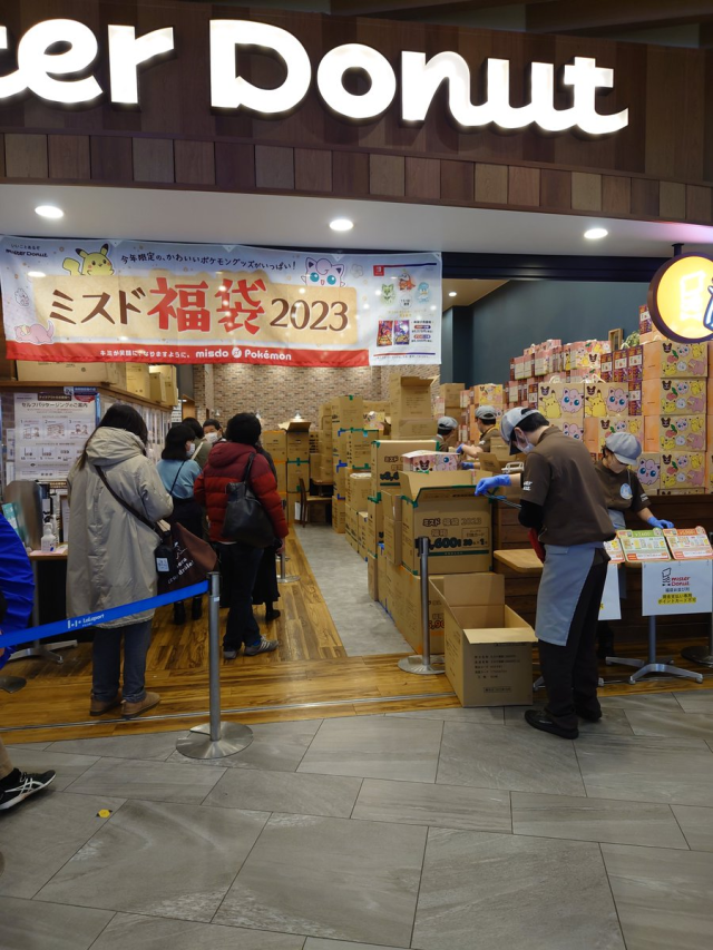 由于购买人潮众多,各地的 Mister Donut 店铺几乎都塞满了库存,以免钱来的消费者买不到,堆积如山的纸箱与福袋盒更是让人瞠目结舌。