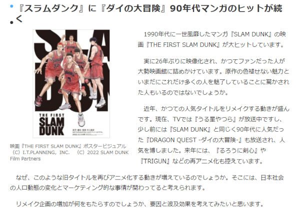如同人气漫画动画化容易吸引关注一样,曾经的名作动画即便搬到现代也很有竞争力,因此才会备受重视吧。以《灌篮高手》新电影来说是时隔26年推出影像作品对20代10代的人来说可说是新作品。而40代的人来说是度过青春时代的怀旧作品。
