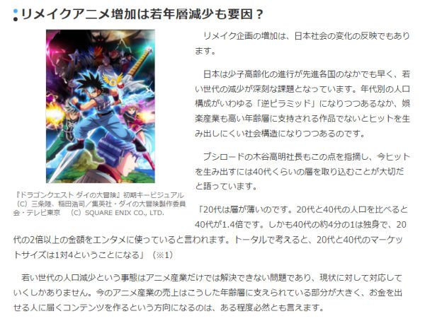 当然,报导亦指出这种现象可能与日本面临严重的少子化更有关。指重制动画的增加也反映着日本社会的变化。由于日本在先进国家当中,少子高龄化进展得特别快速,面临着年轻人不足的严重问题。