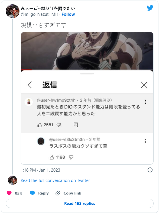 这个例子就发生在一名叫做みぃーご~オオナズチを爱でたい(@miigo_Nazuti_MH)所目睹的真实案例。日前他在Twitter上分享,表示他在YouTube上遇见有人这么说:「在第一次看这部动画的时候,我一度以为迪奥的替身能力,是只能让爬楼梯的人往回走两格阶梯」。