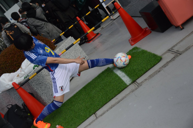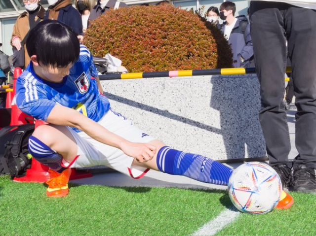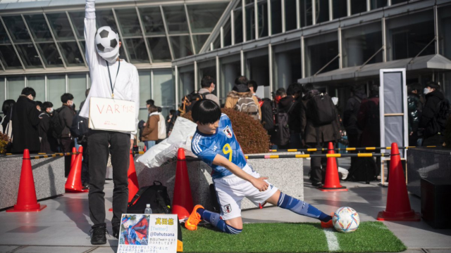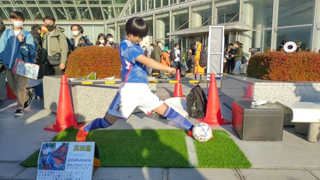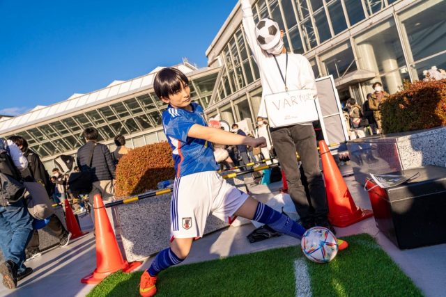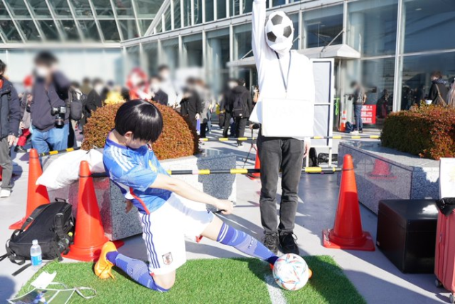 而选择 Cos 这球的真田悠,是出身名古屋的 Coser,因为对于足球赛热爱,这次决定选择这个堪称日本今年最让人震撼的经典一球来表现,除了还原足球场的场地跟球外,身穿三笘薰的球衣并摆出那把球救回的姿势,配上旁边友人担纲 VAR 裁判的辅助,整个还原到位也让不少观众与网友啧啧称奇。