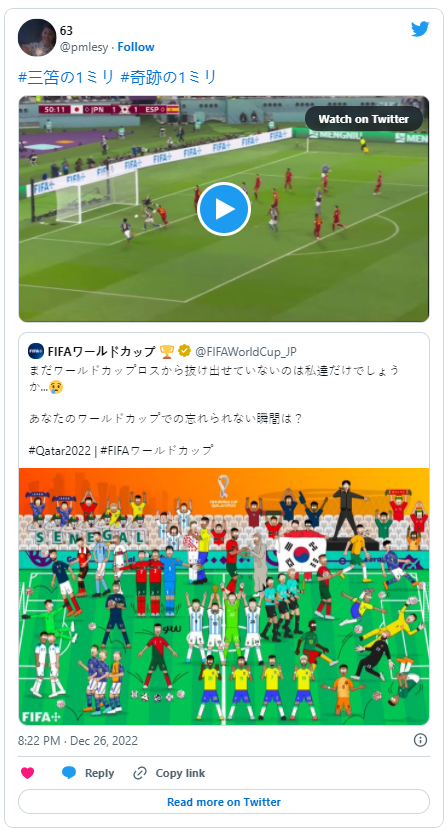 这球出现在小组赛的西班牙对上日本的一战,下半场换上的三笘薰在平手时刻在球出界前勾回中路,助攻给田中碧踢进逆转一球。原先有出界的疑虑,后续经过 VAR 介入审定后,确定这球在出界前救回,也成为日本晋级 16 强的关键,这球更让国际惊呼连连。