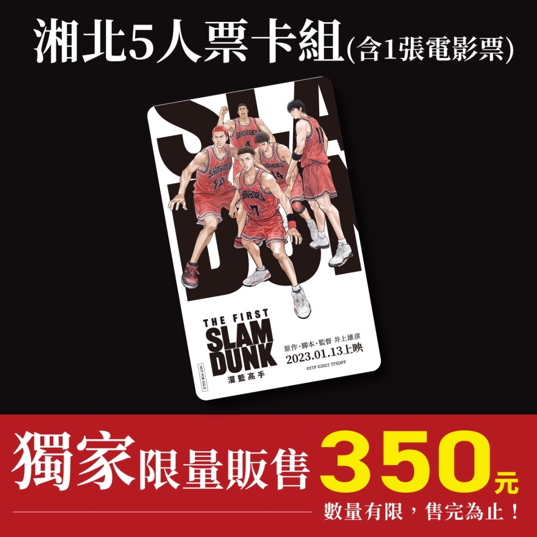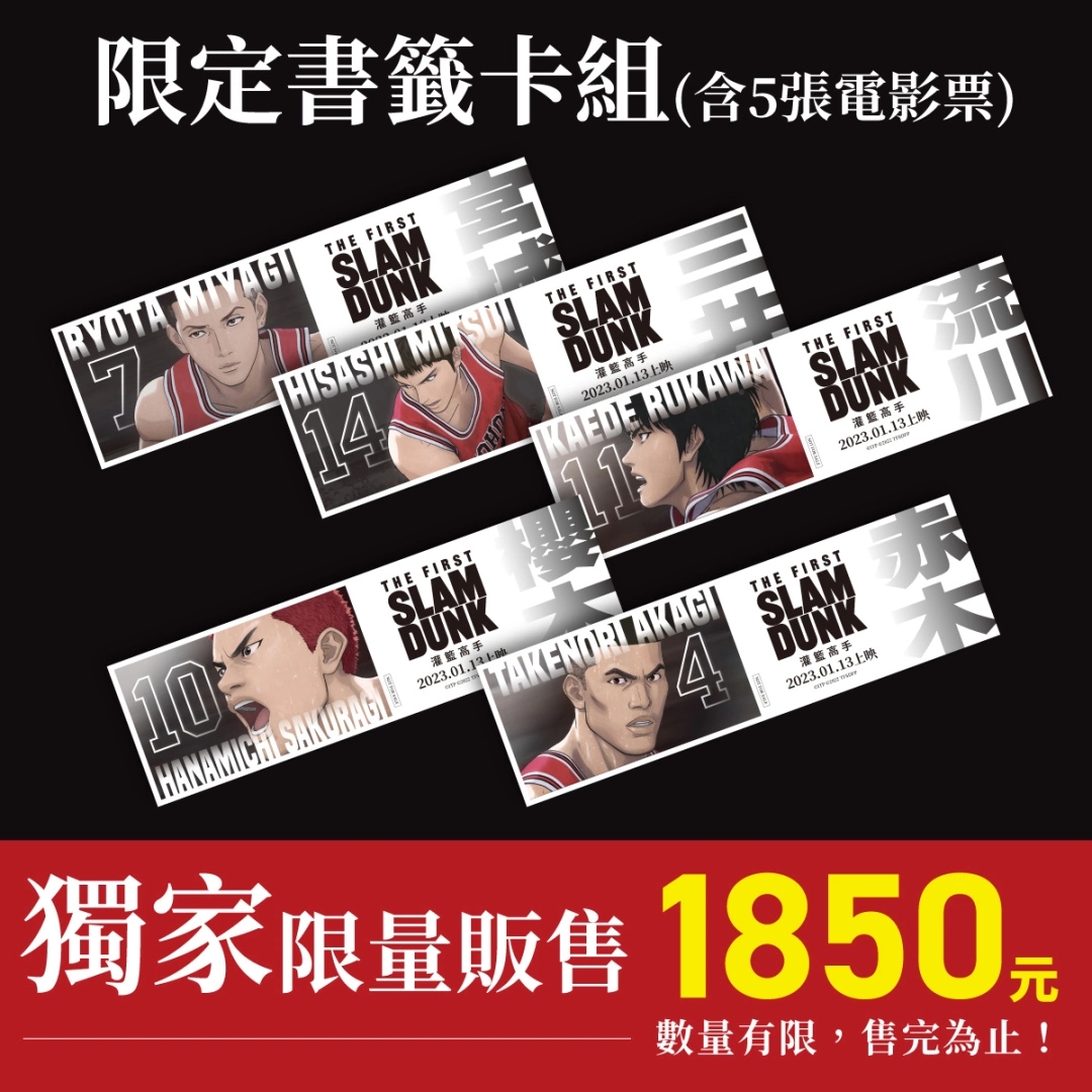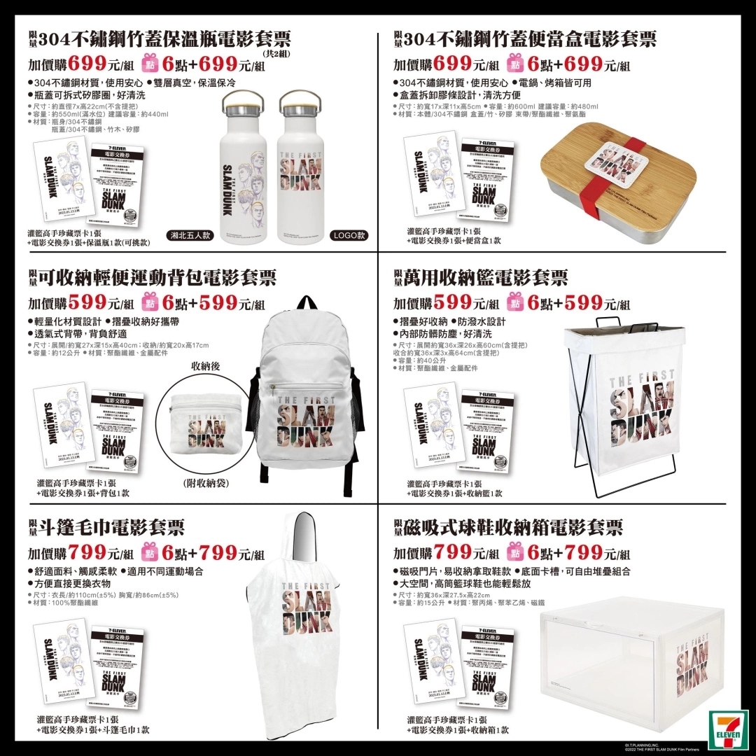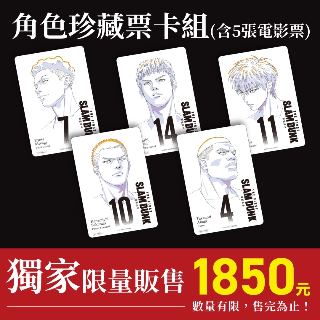 影迷有机会透过博客来售票网一次蒐集到五张「角色珍藏票卡」,其他还有「湘北 5 人票卡组」跟「限定书签卡组」。7-ELEVEN独家贩售「灌篮高手电影套票组」,每一组除了有珍藏票卡 1 张、电影交换券 1 张,还有周边商品 7 选 1,内容涵盖:不鏽钢竹盖保温瓶(2 款)、不锈钢竹盖便当盒、可收纳轻便运动背包、万用收纳篮、斗篷毛巾、磁吸式球鞋收纳箱。