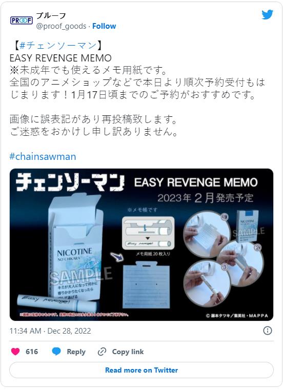首页 / 周边 / Easy revenge!《链锯人》早川秋的「复仇烟」化为便条纸,未成年也可安心使用
