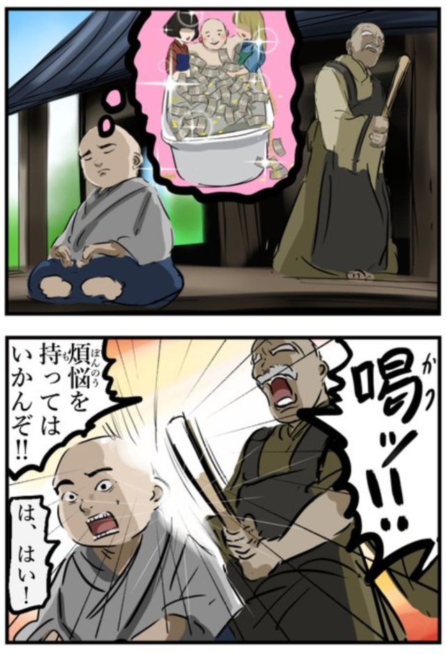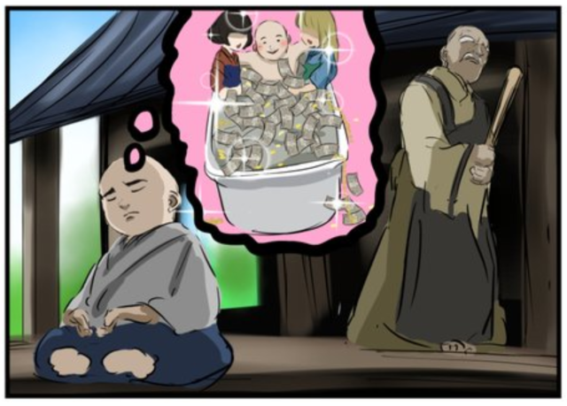 首先是正在打坐禅修的徒弟,因为脑海中尽想着金钱与女人,这种奢华富裕的幻想当然是被老师傅一棒打醒,出家人可不是像你这般思维的 !