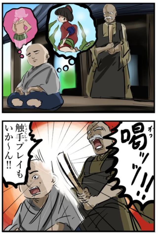 没想到再次进入坐禅,弟子这次想的居然是…「透明人」与「触手 Play」,这种瑟瑟肮脏的思维当然也是被一棒敲醒,这位小师弟到底平常都在干嘛 ( ? )