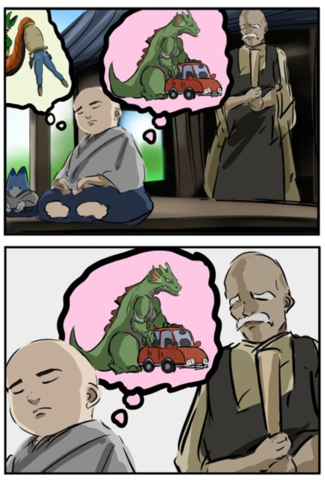 接下来继续坐禅,这次小师弟想的….是「龙干车」、「赛鲁吸收 18 号 Play」…,这下子连师傅都头痛了,这弟子的杂念可能不是敲几下就能化解的了 XD。