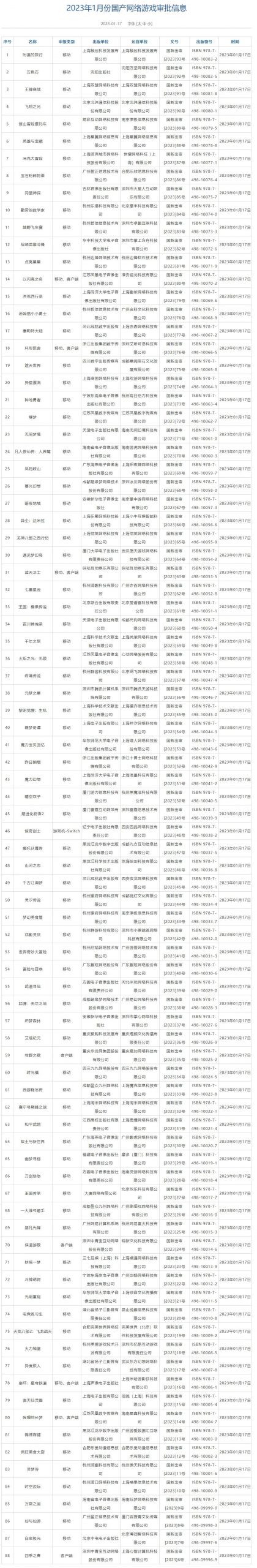 中国新闻出版署发布2023年1月网络游戏审批信息,国产网络游戏共88款获批。其中1款Switch游戏《惊奇剑士》,3款Pc游戏《侠道游歌》等,5款移动PC双平台《崩坏:星穹铁道》、《牟哩的长梦》等,其馀均为手机端游戏《火炬之光:无限》、《白夜极光》等过审。